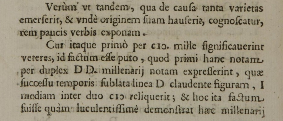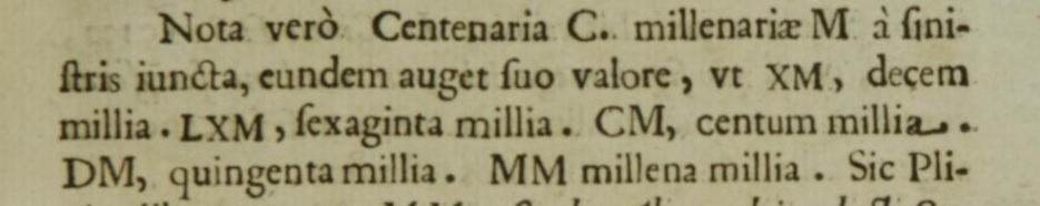 Почему же тогда сначала через CIƆ. древние обозначали тысячу, думаю, что это было сделано потому, что первые использовали этот знак двойным D D. выразили тысячелетний бренд, который с ходом времени удалил линию ⱭD, закрывающую фигуру, оставив I посередине между двумя CIƆ; И что это было сделано таким образом, что этот тысячелетний знак