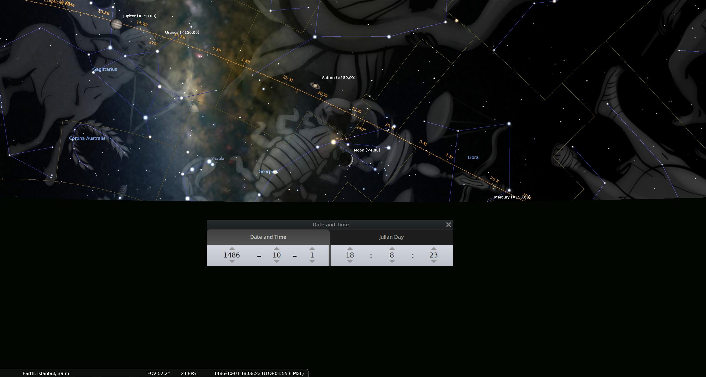 Согласно программе Stellarium 23.2, Меркурий зашел в 18:10, а не в 20:15 Это не может быть ошибка летнего времени, т.к. разница 2 часа и заход всех остальных планет указан правильно. Также не может быть ошибкой в вычислении движения быстрой планеты Меркурий, т.к. все созвездие Весов, где правильно указан Меркурий, закатилось в 19:15.