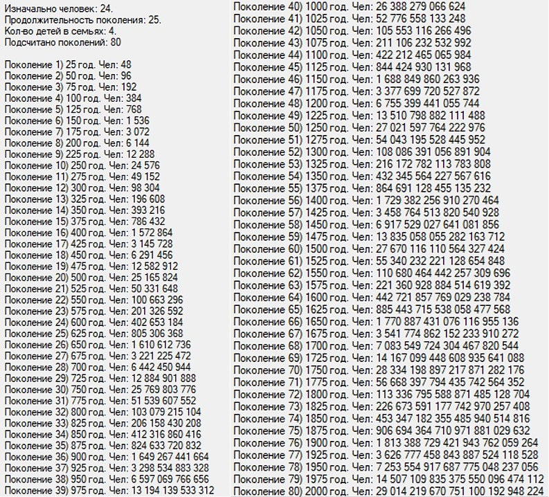 Мне попалась на подсчет Притча о Зернах на Шахматной Доске. В ней говорится, что за 63 удваивания на 64 клеточке Квадриллионы зерен. Из этого я вывел железный расчет: Так как нас на Земле 7,6 млрд человек, то размеожились мы до этой численности всего за 28-30 поколений, даже с учетом войн. Таким образом если взять наложение на поколение 25 лет, просчитывается всего жизни человечества 700-750 лет. Остальное увеличение истории афера и не научное фальшивое удлиннение. В представленной д