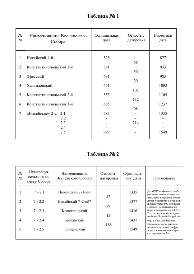 Когда был сделан расчет даты 7-го собора по наибольшему значению – 997, оказалось, что он точно «попадает» в Тридентский собор. Это значит, что соборы 7.4 и 7.3 что до него происходили попадают еще в два католических, а 7.2 в тот самый странный «Первый и Второй» собор по Матфею Властарю. Таким образом, выбрав пять промежуточных соборов, мы без всяких «дыр» сшили в одно целое хронологию по Вселенским соборам. Для наглядности к Табл.1 прилагается и Табл.2»».