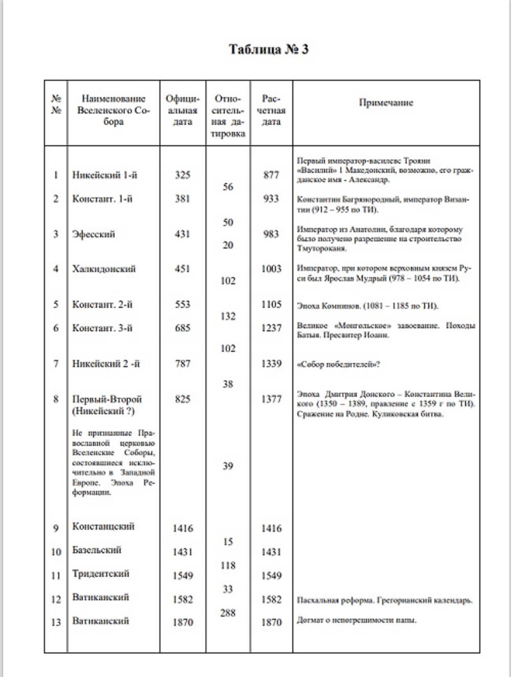 Глядя на таблицу №3 можно сделать вывод, что Новый Рим, Византия, Троянь, т.е. тройственный союз разных народов, просуществовал в течение всего одного Великого индиктиона (ВИ) с 877 по 1409 год, когда все Вселенские соборы (ВС), которые признавала православная церковь (ПЦ) проходили на ее землях, а уже в самом начале следующего ВИ все ВС собираются только в Западной Европе и ни один из них ПЦ не признается. Таким образом, делается вывод, что западная, восточная и славянская цивилизации впредь развивались только самостоятельно, независимо друг от друга.