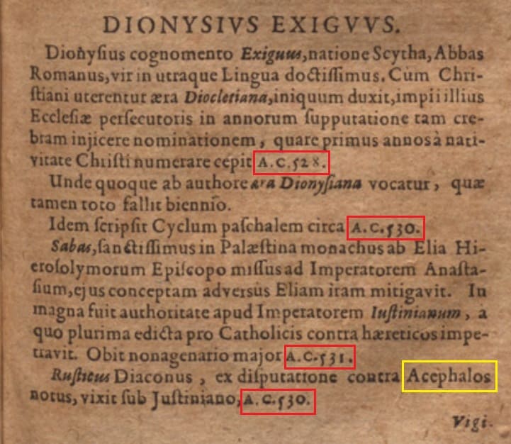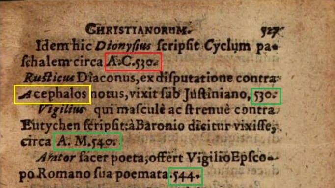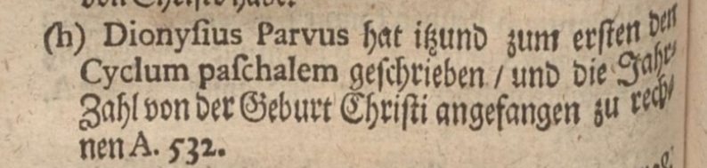 В изданиях M. Wilh. Stratemanni THEATRUM HISTORICUM 1656 года и 1694 года Dionysius Exiguus больше не встречается, не встречается в нем и Dionysius Petavius (Petau, Petavii).