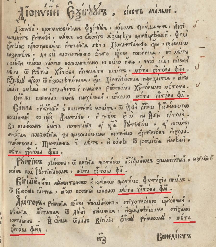 3. Содержимое заголовка 'ДИОНИСИЙ ЕХИГYYС', си есть малый, перевода 'ФЕАТРОН или ПОЗОР' соответствует по объему тексту издания 1694 года и содержит все соответствующие ему подчеркнутые красным даты, т.е A.C. 528, A.C. 530, A.C. 531, A.C. 530, A.C. 540 и A.C. 544.