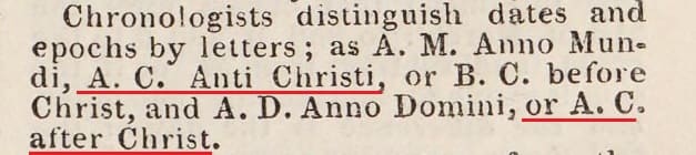 Сокращенная аббревиатура A.C. может читаться как Anti Christi и выражать тоже самое что и годы B.C., а также аббревиатура A.C. является годами от Рождества Христова как и аббревиатура A.D. Anno Domini. Аббревиатуру A.D. можно принять за годы Диоклетинана. Аббревиатуру A.M. Anno Mundi принять за Anno Martyrum.