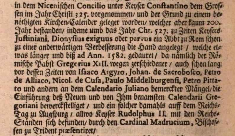 На Никейском соборе, созванном императором Константином Великим в 325 году от Рождества Христова, был заложен фундамент необходимого церковного календаря, который, однако, просуществовал едва ли 200 лет. Около 527 года от Рождества Христова, во времена императора Юстиниана, Дионисий Exiguus (Малый), или Parvus (Маленький), аббат в Риме, уже приложил руку к ожидаемому улучшению / которое длилось несколько дольше и дошло до 1582 года, когда римский папа Григорий XIII, а также задолго до его времен Исаак Аргир, Иоанн Сакробоско, Пётр д'Альи, Николай Кузанский, Павел Миддельбургский, Пётр Питат и другие заметили недостатки в юлианском календаре. Введение нового григорианского календаря, названного в его честь, было осуществлено и представлено тогда на рейхстаге в Аугсбурге, где император Рудольф II находился вместе с имперскими сословиями, кардиналом Мадруцци, епископом Триентским.