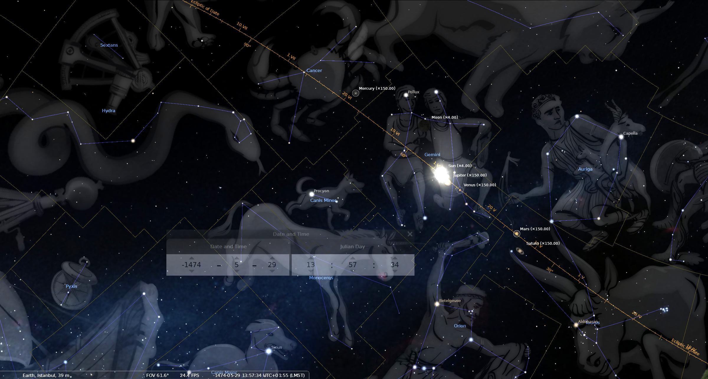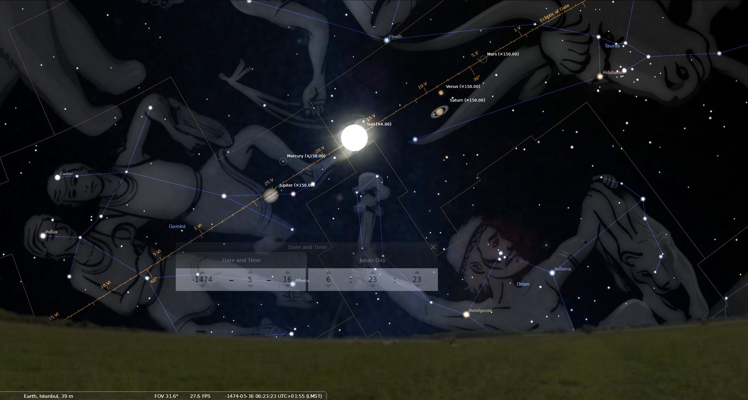Почему вы в своем решении 1474 г до н.э. говорите об июне, когда на рисунке у вас 16 мая? Но 16 мая Луна была в Стрельце, а половина планет была скорее в Тельце. Для середины июня звездная ситуация была еще хуже.AlexanderFedoseev писал(а): ↑18 июн 2024, 22:23 А это результат для июня 1474 года ДО нашей эры (согласуется с официальной историей из википедии)