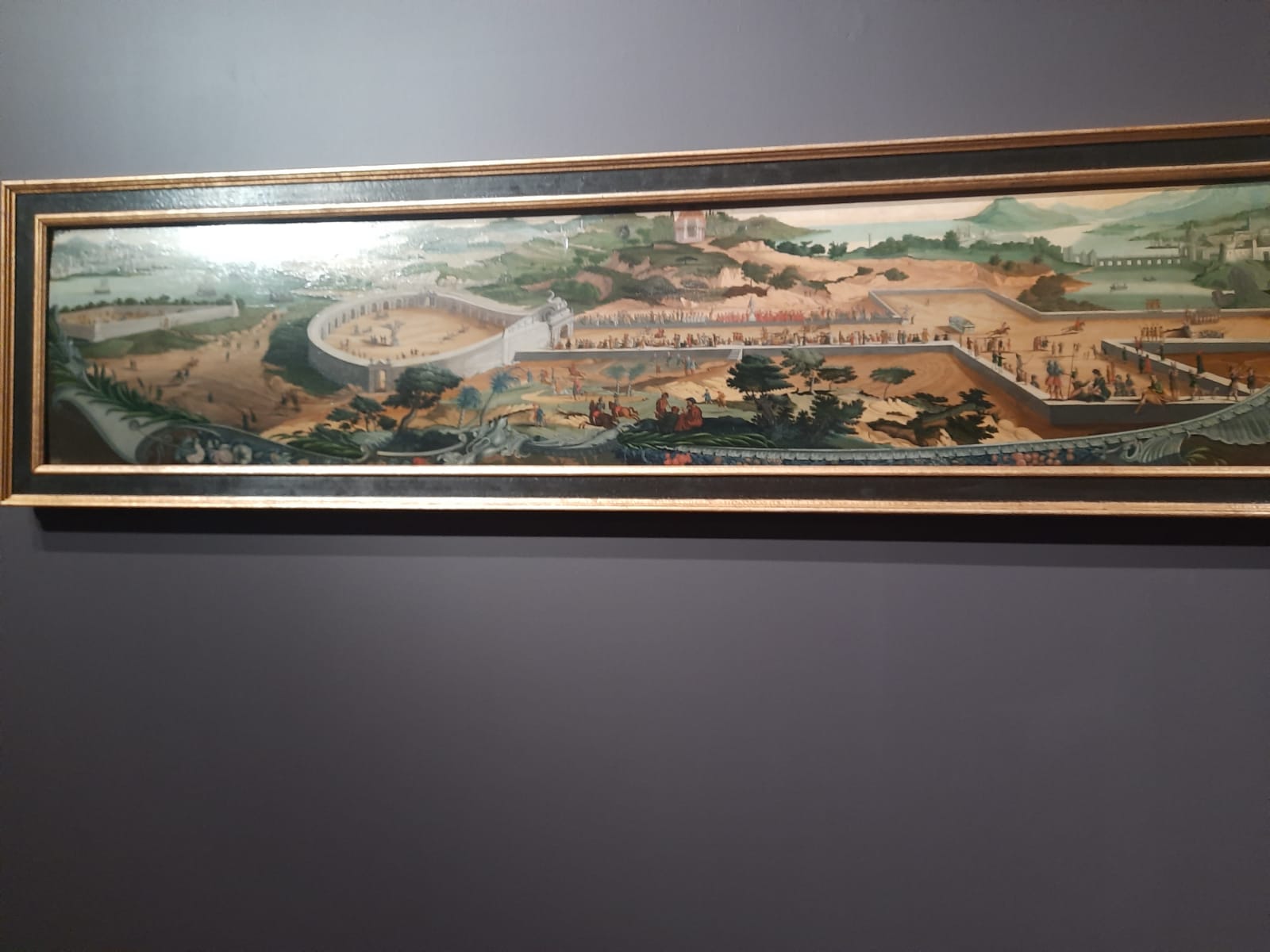 Полукруглое сооружение слева на картине напоминает арену для гладиаторских боев, как в античных амфитеатрах, справа, в виде креста - ристалище? Место для рыцарских поединков? ИМХО, конечно...