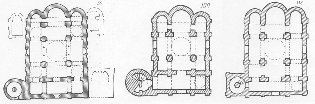 Кроме того, как оказалось, в 32 храмах лестница на хоры располагалась внутри стены, где с трудом могли разминуться два человека . Как правило, для этого использовалась западная стена, которая поэтому была значительно толще других, либо северная или южная стена в той их части, которая была ближе к западу, поскольку и наружный вход в храм, и колокольня над ним всегда расположены с запада. Ещё в 2 случаях автор каталога отмечает, что западная стена исследуемого объекта была толще других, но об обнаружении внутристенного прохода не упоминает. В 14 памятниках для подъёма на второй этаж имелись лестничные башни (в некоторых случаях удалось обнаружить остатки винтовых лестниц). Сооружение лестничной башни, скорее всего, диктовалось жёсткой необходимостью сделать проникновение на второй этаж контролируемым, поскольку такие башни явно нарушали симметрию здания (илл. 55) и эстетики ему не придавали.