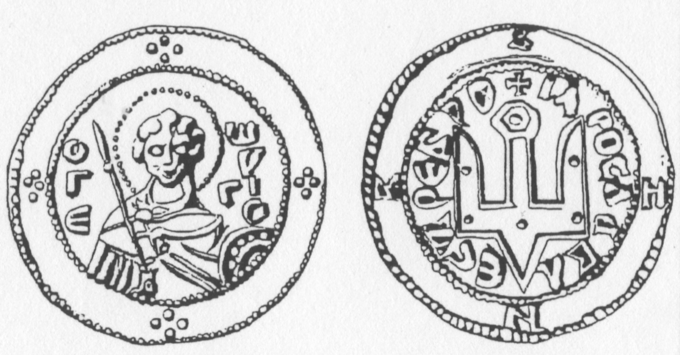 «В X – начале XI вв. в Киевской Руси при князьях Владимире, Святославе и Ярославе чеканятся знаменитые монеты с загадочными для исследователей «двузубцами» и «трезубцами»» [18, с. 124]. По мнению Шаповалова, разделяющего догадку, высказанную в 1861 г. И.А. Бартоломеем, этот символ, именуемый также «знаком Рюриковичей», представляет собой изображение деревянного якоря, окованного металлом, что подтверждается наличием кольца для продевания каната. Обратим внимание на то, что над якорем имеется маленький крест, а с обратной стороны таких монет присутствует изображение Христа или св. Георгия (илл. 9).