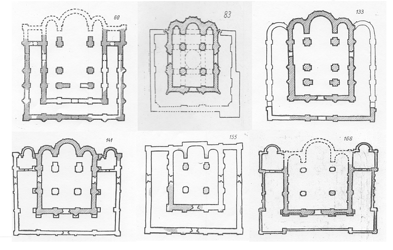 Планы памятников №4 («Киев. Здание к юго-западу от Десятинной церкви») и №5 («Киев. Здание к юго-востоку от Десятинной церкви») частично восстановлены, поэтому есть основания считать, что это не храмы. Правда, находятся они в непосредственной близости от Десятинной церкви (№1) и могут иметь к ней какое-то отношение. Планы памятников №16 («Киев. Здание на Ирининской улице») и №151 («Смоленск. Терем») восстановить удалось в достаточной мере, чтобы, во всяком случае, убедиться в том, что храмами они не являются.