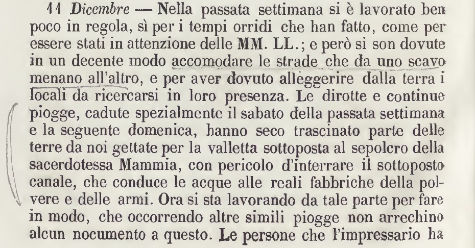 11 декабря - За прошедшую неделю было сделано очень мало работы в соответствии с правилами, как из-за ужасной погоды, так и из-за того, что они находились в поле зрения MM. LL.; тем не менее, дороги, ведущие от одного раскопа к другому, пришлось привести в приличный вид, а помещения, в которых они будут находиться, - очистить от земли. Непрерывные и сильные дожди, прошедшие в субботу на прошлой неделе и особенно в следующее воскресенье, унесли часть насыпанной нами земли в небольшую долину под усыпальницей жрицы Маммии с опасностью заиливания расположенного ниже канала, который ведет воды к королевским пороховым и оружейным заводам.