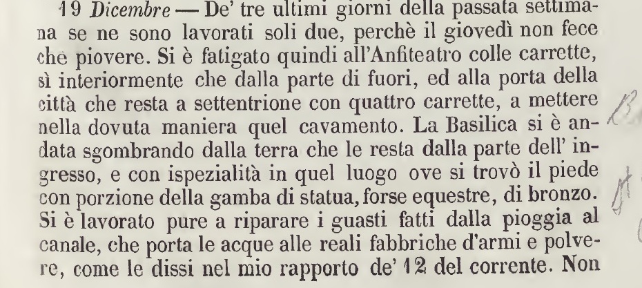 19 декабря - Из трех последних дней прошлой недели работали только два, потому что в четверг шел дождь. Поэтому в Амфитеатре работали с телегами, как внутри, так и снаружи, а в городских воротах, которые остались на севере, с четырьмя телегами, чтобы привести эти раскопки в надлежащий вид.