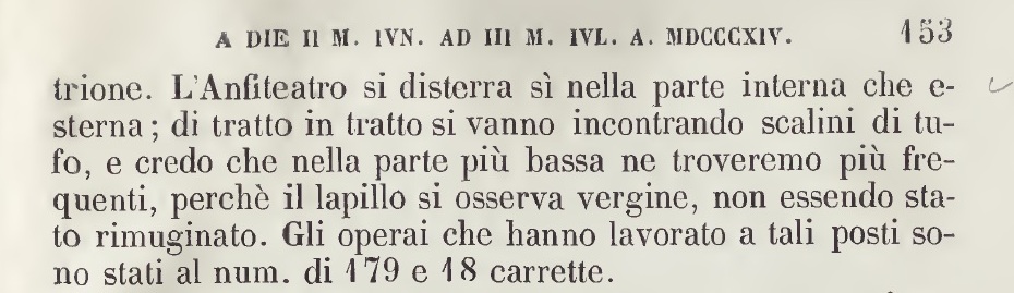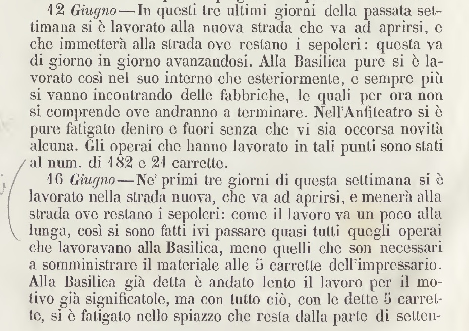 16 июня - В первые три дня этой недели проводились работы на новой дороге, которая вот-вот откроется и приведет к дороге, где остались гробницы: поскольку работы занимают немного больше времени, поэтому почти все эти рабочие, работавшие на Базилике, за вычетом тех, кто необходим для подачи материала на 5 тележках импресарио.
