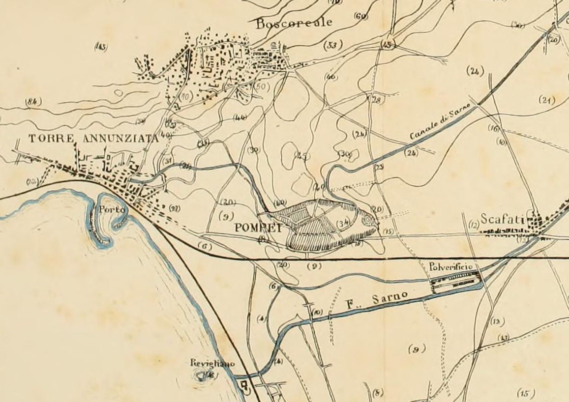 Поэтому слева его находится канал водовода Сарно названный рекой Сарно, справа, имеется надпись - Древний берег моря до извержения 79 года.