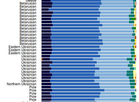 Admixture - это программа позволяющая по составу компонентов визуально отслеживать происхождение народов.