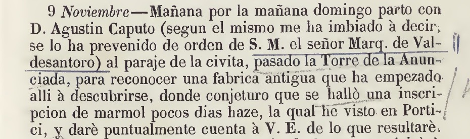 чтобы осмотреть древнюю фабрику, которую там начали открывать, где, как я полагаю, несколько дней назад была найдена надпись из мрамора, которую я видел в Портичи, и о результатах я пунктуально отчитаюсь перед В. E. о том, что я найду.