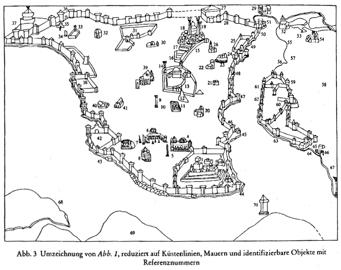 Так, мечеть Баязида (11), строительство которой было начато в 1501 году, и крупная верфь Касымпаша (56), существовавшая с 1513 года, обозначены на виде именно так, но на самом деле не изображены. Дворец Топкапы вряд ли изменил свой внешний вид из-за своего первоначального использования в качестве резиденции.
