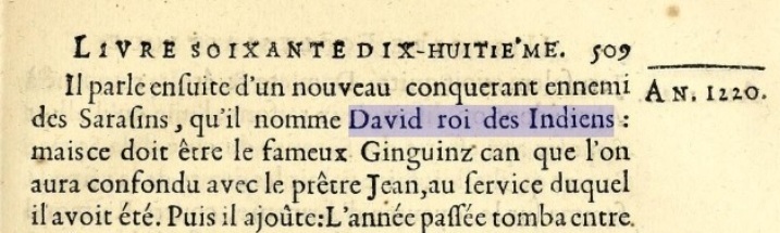 Il parle ensuite d’un nouveau conquérant ennemi des Sarrasins, qu’il nomme David roi des Indiens: mais ce doit être le fameux Ginguinzcan que l’on aura confondu avec le prêtre Jean au service duquel il avoit été.
