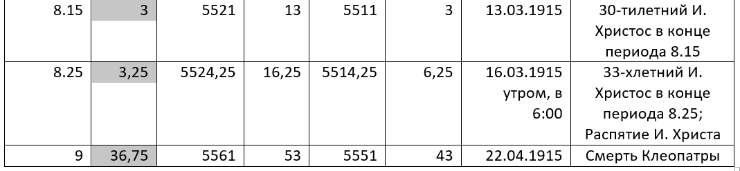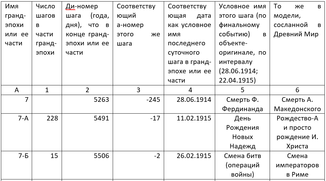 Предположим, что Лихачев, будучи наедине и с порывом честности, воспринимает Древний Мир как модель и фиксирует соответствие с объектом-оригиналом. Уточним, что интервал (29.01.1900; 22.04.1915) – это часть хронологического и мет-исторического объекта-оригинала. Соответствующий диапазон лет в Древнем Мире (а он лишь выдуманная модель) таков: (-5508; 53), см. а-номера лет в графе 3 Таблицы 1.