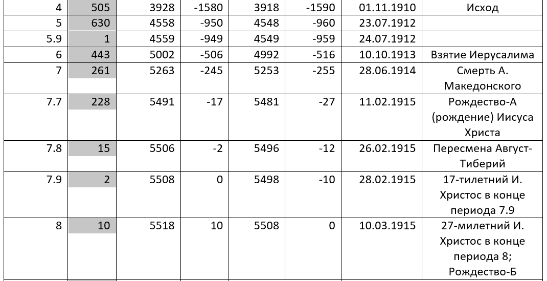 По графе 2 нарастающим итогом отражаются те же шаги (сутки или годы), что даны в разрезе гранд-эпох по графе 1. По графе 3 данные графы 2 повторяются, но с одинаковым уменьшением каждого числа на константу 5508. Данные графы 4 тоже получаются на базе графы 2, но вместо вычитания константы 5508 применяется увеличение на константу 29. После такого увеличения в каждой строке графы 4 получается натуральное число, причем оно сразу переводится в формат даты (что свойственно для большинства электронных таблиц, откуда и взят термин «формат даты»). Например, число 29 предстает в формате даты как 29.01.1900. Аналогично, число 129 предстает в формате даты как 09.05.1900.