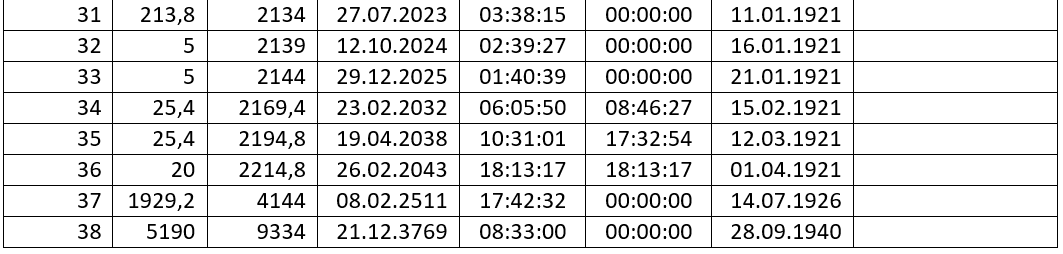 Если по годам, то вся Таблица 2 касается огромного периода, в котором 14842 года (из них 5508 до точки н.н.э.). От начальной даты 08.02.1900 до конечной даты 28.09.1940 опять-таки ровно 14842 шага (здесь – дня). Приняв во внимание 14842 трилума, мы видим их начало в точке 14.12.169 08:33:00, а конец в точке 21.12.3769 08:33:00. Если по УГ-календарю, то между этими датами 3600 лет и еще 7 суток. Однако, по лум-календарю в начале тоже 21-ое декабря, а не 14-ое. По лум-календарю разброс крайних дат по графе 3 Таблицы 2 составляет ровно 3600 лет (3769 – 169). На этом первичный обзор ОМ-системы-2 завершен, хотя рассмотрены далеко не все ее нюансы.