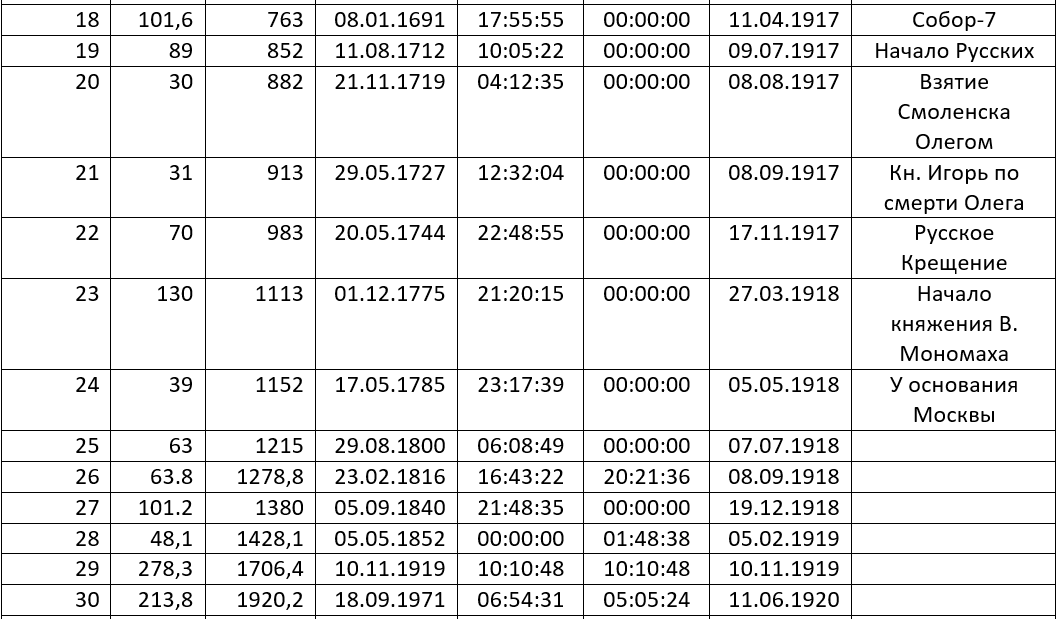 В гранд-эпохе 18 примерно 101,6 шага, но Собор-7 позже Собора-6 ровно на 122 шага. По динамике суток Собор-7 приходится на 11.04.1917. Соответствующий трилум завершается датой 08.01.1691. Гранд-эпоха-18 завершается в апреле 1917 года («тени» Полу-Древнего Мира при этом в году 763). Чем завершается? Неким Собором-7. В чем его истинная суть? Неизвестно. Ясно лишь, что приближалось, намечалось в относительно близком будущем некое «переложение книг на славянский язык». В рамках объекта-оригинала это означает намечавшееся усиление международной значимости России. Правда, не все намечавшееся сбылось, да и сбылось не сразу (уже в форме усиления СССР).
