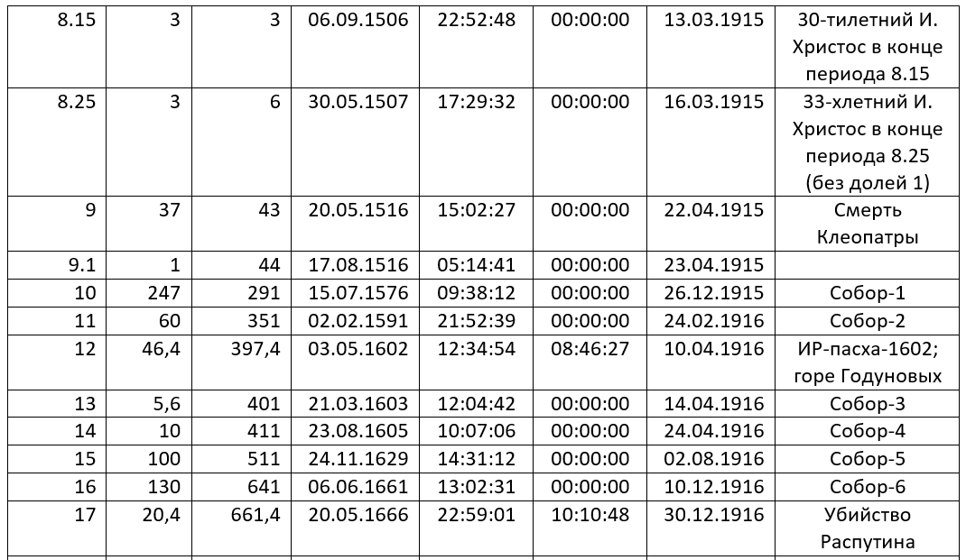 Необходимо помнить, что прообраз (объект-оригинал) событий имеет посуточную динамику, а выражена она (как и в Таблице 1) данными графы 6 (теперь смотрим эту графу в Таблице 2 по строке 10, а там дата 26.12.1915). Германия в конце 1915 года надеялась на прямые переговоры с Англией, Францией или Россией (без посредничества США). Никакого реального Собора-1 (в глобальном смысле) в декабре 1915 года не наблюдалось и не намечалось. Впрочем, заявление Германии (от 26.12.1915; ответ США) теоретически допускало переход к мирным переговорам (именно без посредничества США, которое Антанта хотела навязать прогерманскому Четверному Союзу). Здесь и завершение гранд-эпохи 10. Сами мы это определили или с подачи Лихачева – неважно.