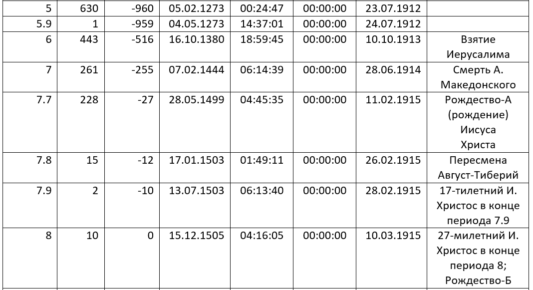Число 100 (см. слагаемые 10 и 89 вверху гр. 1 Таблицы 1, а также добавочную единицу по строке 5.9) автор ТЛ-сборника дает не перед числом 2242, а непосредственно перед числом 443. В тексте ТЛ-сборника (см. с. 1) дано именно «100, 443». Поскольку есть пробел, постольку Лихачевым даны несомненно два числа, а не одно (с тремя знаками десятичной дроби после запятой). Из-за рассмотренных нюансов приходится констатировать, что в графе 1 Таблицы 1 ориентировочно передана именно лишь общая идея Лихачева (вероятно, что и многих исходных мет-историков). Впрочем, куда ни ставь число 100 (правда, строго не выше-позднее гранд-эпохи 6, в которой 443 шага), все-таки правильным является вывод, что от Адама («новорожденного», только-только мет-исторически явившегося в роли Первого Человека) до взятия Иерусалима прошло (по данным Лихачева; о верификации с использованием других первоисточников здесь речи нет) 5002 года (почти ровные 5000 лет). Этот вывод не наш, а самого автора ТЛ-сборника. Хоть нам пришлось вспомнить и применить кое-что из арифметики, но все-таки число 5002 (гр. 2 по стр. 6 Таблицы 1) косвенно (однако, точно) дает нам сам Лихачев. Опять же точно даны самим автором ТЛ-сборника числа 5263 и 5508 (ниже по той же графе). Имеется в виду точность наличия слов-утверждений Лихачева в тексте ТЛ-сборника. Например, нам не попусту кажется, а Лихачев точно (действительно) утверждает, что взятие Иерусалима было за 261 год до смерти А. Македонского. Кстати, в этом случае (что бывает редко) Лихачев дает число 261 не только точно (действительно), но и непосредственно (на готовенькое, сразу открытым текстом, даже без приглашения или принуждения заниматься арифметическими расчетами).