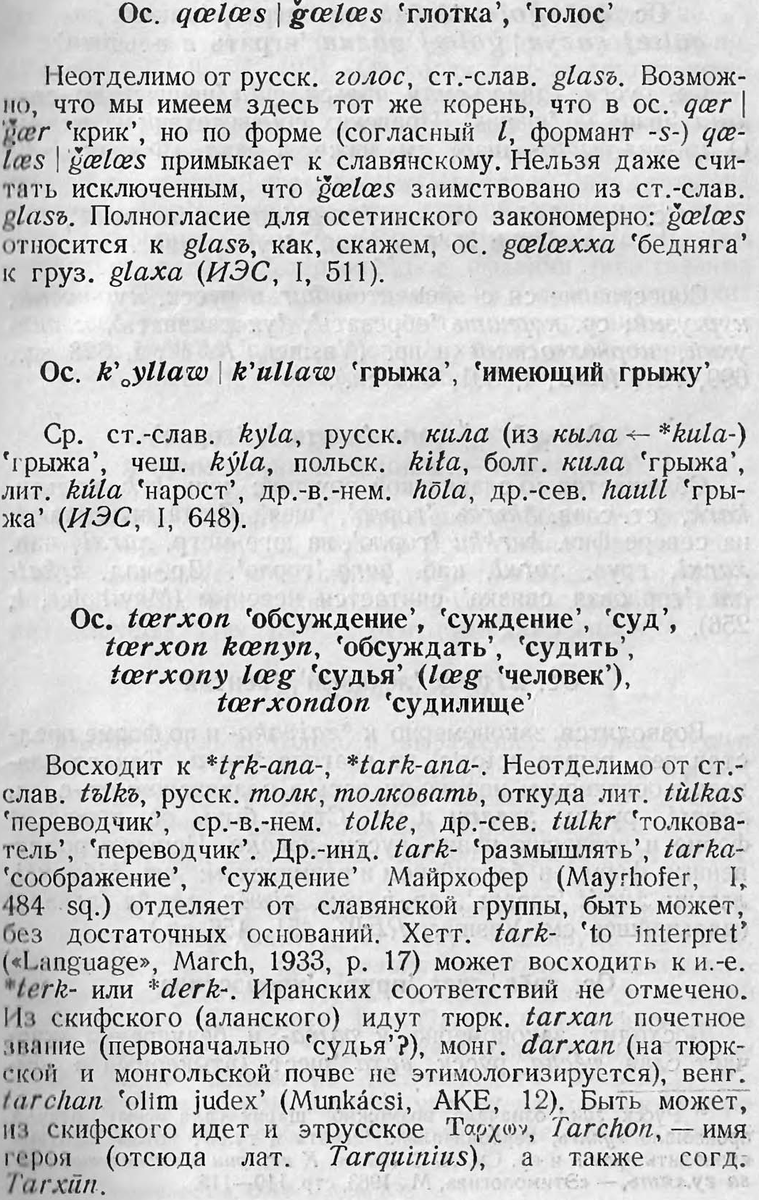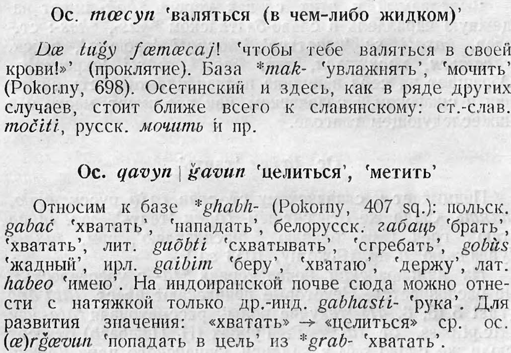 Как и следовало ожидать, особенно многочисленны и значительны изоглоссы, связывающие осетинский со славянскими языками. Здесь мы имеем не только лексические, но и некоторые важные грамматические связи, что указывает на особую длительность и интимность контактов."